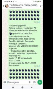 Em uma publicação nas redes sociais, o homem que realizou o ataque fez ameaças a figuras públicas brasileiras, como o jornalista William Bonner e políticos veteranos como José Sarney, Geraldo Alckmin e Fernando Henrique Cardoso. Na mensagem, ele afirmava que “o jogo acaba dia 16/11/2024” e alertava as autoridades sobre uma bomba que precisaria ser desarmada em 72 horas. O texto continha ofensas e insultos direcionados a essas personalidades, criando um cenário de alarme entre as autoridades e a população.